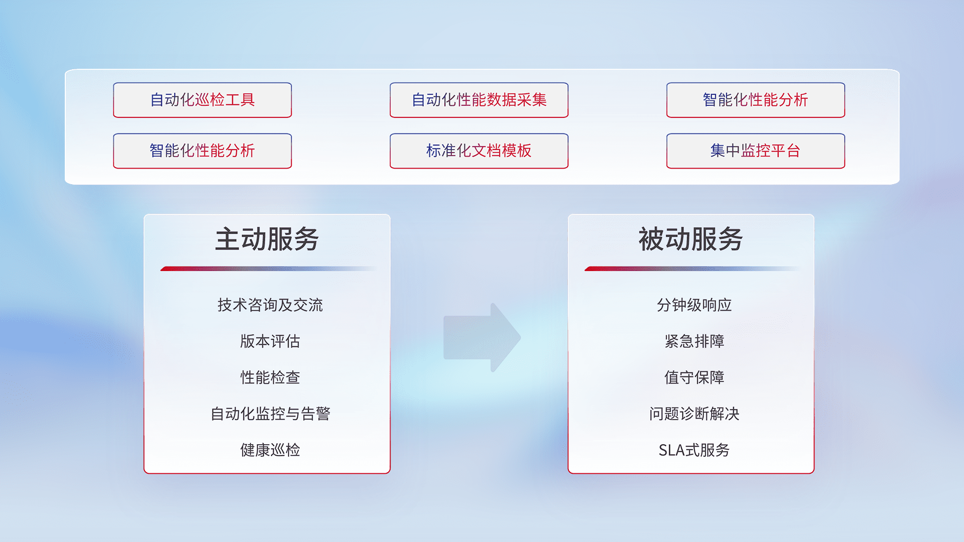 智能化工具和标准化文档,,,,保障服务质量,,,提供主动服务(包含技术咨询、、、、版本评估、、、、性能检查、、、自动化监控与告警、、、健康巡检)和被动服务包含(分钟级响应、、、紧急排障、、、值守保障、、、问题诊断解决、、SLA服务)。。。