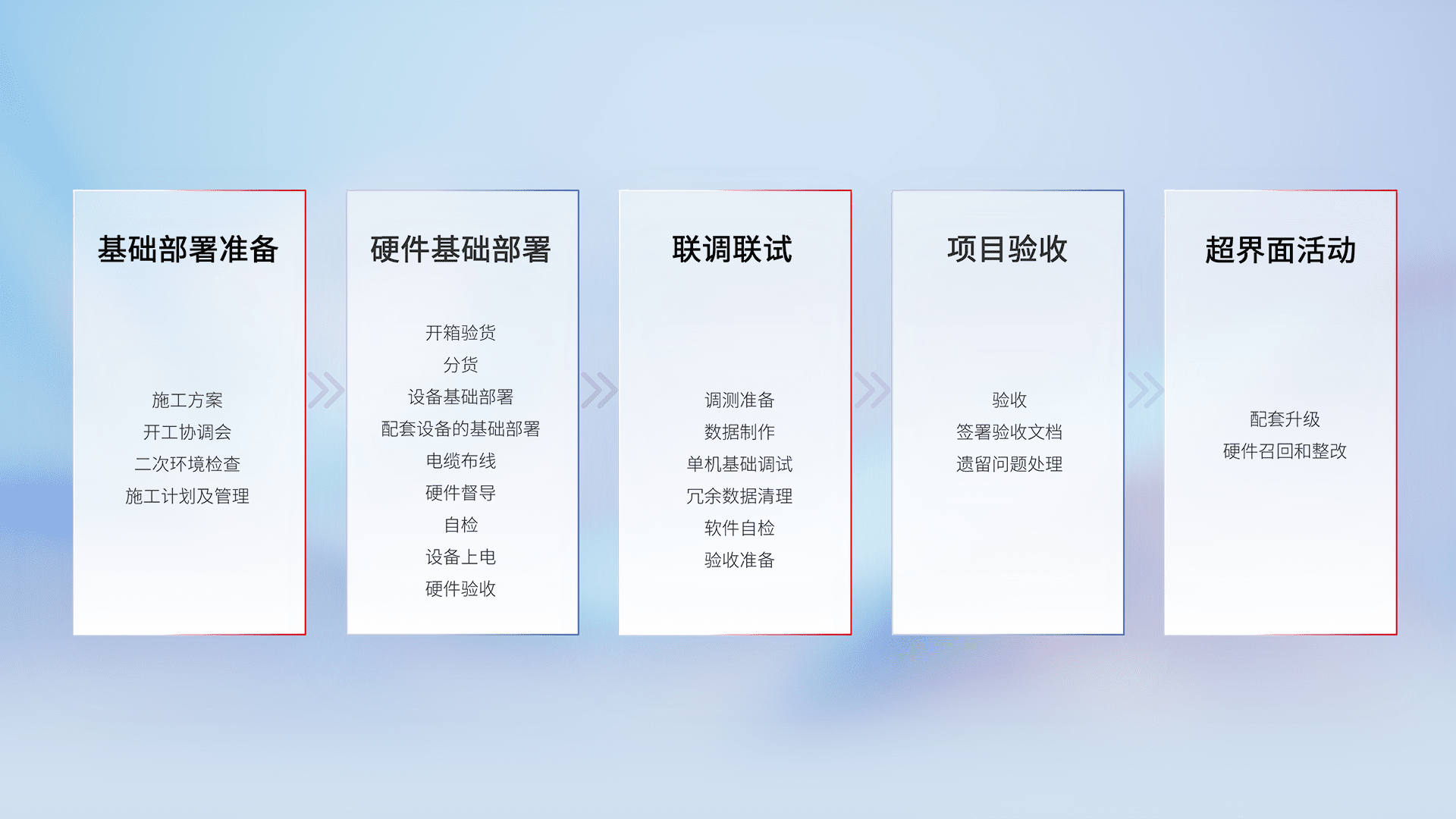 从基础部署准备、、、硬件基础部署、、、、联调联试、、项目验收、、、、越界面活动的全过程可追溯,,,,保证施工质量和进度。。